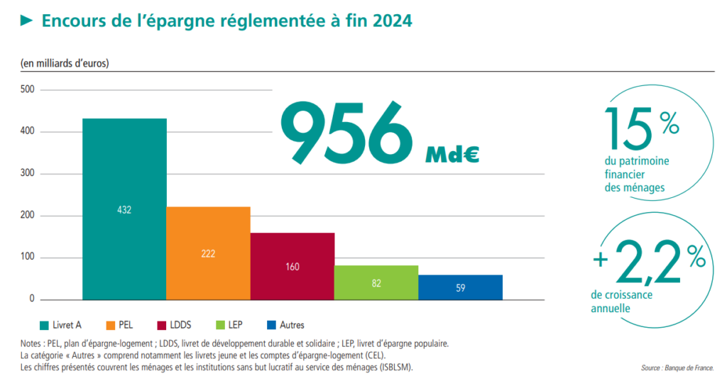 L’épargne réglementée connaît chaque année une collecte dynamique (956 milliards d’euros d’encours fin 2024 selon la Banque de France), comme le montre le graphique ci-dessous.