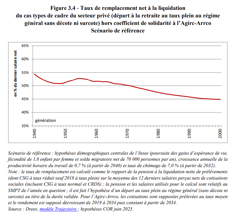 Voici le taux de remplacement pour un salarié non cadre du secteur privé selon le rapport annuel du Conseil d’orientation des retraites (COR) de juin 2025 :
